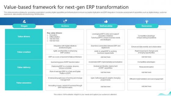 This slide presents a strategy for assessing organizations existing digital capabilities and infrastructure to ensure successful digitization and ERP integration. It includes assessment of capabilities such as digital strategy, customer experience, data analytics and technology infrastructure. Do you have an important presentation coming up Are you looking for something that will make your presentation stand out from the rest Look no further than Value Based Framework For Next Gen Erp Transformation Erp And Digital Transformation For Maximizing DT SS V. With our professional designs, you can trust that your presentation will pop and make delivering it a smooth process. And with Slidegeeks, you can trust that your presentation will be unique and memorable. So why wait Grab Value Based Framework For Next Gen Erp Transformation Erp And Digital Transformation For Maximizing DT SS V today and make your presentation stand out from the rest This slide presents a strategy for assessing organizations existing digital capabilities and infrastructure to ensure successful digitization and ERP integration. It includes assessment of capabilities such as digital strategy, customer experience, data analytics and technology infrastructure.