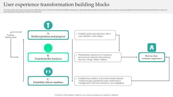 The below slide discusses how customer satisfaction can be raised through fundamentally changing the organizational perspective toward customers as well as making operational and technological advancements. Key steps are build aspiration and purpose, transform business etc. Showcasing this set of slides titled User Experience Transformation Building Blocks Professional Pdf. The topics addressed in these templates are Build Aspiration, Transform The Business, Establish Critical Enablers. All the content presented in this PPT design is completely editable. Download it and make adjustments in color, background, font etc. as per your unique business setting. The below slide discusses how customer satisfaction can be raised through fundamentally changing the organizational perspective toward customers as well as making operational and technological advancements. Key steps are build aspiration and purpose, transform business etc.