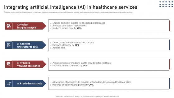This slide covers use of artificial intelligence in healthcare. It involves applications such as medical imaging analysis, analyzes unstructured data, provides valuable assistance and predictive analysis. Formulating a presentation can take up a lot of effort and time, so the content and message should always be the primary focus. The visuals of the PowerPoint can enhance the presenters message, so our Integrating Artificial Transforming Medical Workflows Via His Integration Brochure Pdf was created to help save time. Instead of worrying about the design, the presenter can concentrate on the message while our designers work on creating the ideal templates for whatever situation is needed. Slidegeeks has experts for everything from amazing designs to valuable content, we have put everything into Integrating Artificial Transforming Medical Workflows Via His Integration Brochure Pdf This slide covers use of artificial intelligence in healthcare. It involves applications such as medical imaging analysis, analyzes unstructured data, provides valuable assistance and predictive analysis.