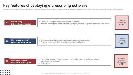 This slide covers type of health information system that deals with effective prescription and simplify medical processes. It involves key features such as instant drug interaction notification, easy prescription and monitored controlled prescription. Explore a selection of the finest Key Features Of Deploying Transforming Medical Workflows Via His Integration Diagrams Pdf here. With a plethora of professionally designed and pre made slide templates, you can quickly and easily find the right one for your upcoming presentation. You can use our Key Features Of Deploying Transforming Medical Workflows Via His Integration Diagrams Pdf to effectively convey your message to a wider audience. Slidegeeks has done a lot of research before preparing these presentation templates. The content can be personalized and the slides are highly editable. Grab templates today from Slidegeeks. This slide covers type of health information system that deals with effective prescription and simplify medical processes. It involves key features such as instant drug interaction notification, easy prescription and monitored controlled prescription.