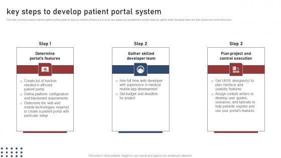 This slide covers process to optimize patient portal system to improve medical efficiency. It involves key steps such as determine portals features, gather skilled developer team and plan project and control execution. The Key Steps Develop Patient Transforming Medical Workflows Via His Integration Brochure Pdf is a compilation of the most recent design trends as a series of slides. It is suitable for any subject or industry presentation, containing attractive visuals and photo spots for businesses to clearly express their messages. This template contains a variety of slides for the user to input data, such as structures to contrast two elements, bullet points, and slides for written information. Slidegeeks is prepared to create an impression. This slide covers process to optimize patient portal system to improve medical efficiency. It involves key steps such as determine portals features, gather skilled developer team and plan project and control execution.
