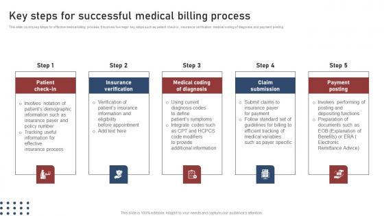 This slide covers key steps for effective medical billing process. It involves five major key steps such as patient check in, insurance verification, medical coding of diagnosis and payment posting. Are you searching for a Key Steps Successful Medical Transforming Medical Workflows Via His Integration Structure Pdf that is uncluttered, straightforward, and original Its easy to edit, and you can change the colors to suit your personal or business branding. For a presentation that expresses how much effort you have put in, this template is ideal With all of its features, including tables, diagrams, statistics, and lists, its perfect for a business plan presentation. Make your ideas more appealing with these professional slides. Download Key Steps Successful Medical Transforming Medical Workflows Via His Integration Structure Pdf from Slidegeeks today. This slide covers key steps for effective medical billing process. It involves five major key steps such as patient check in, insurance verification, medical coding of diagnosis and payment posting.