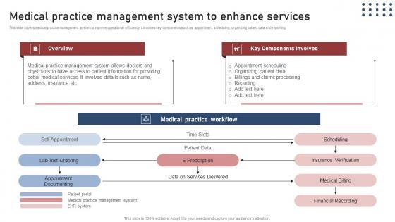 This slide covers medical practice management system to improve operational efficiency. It involves key components such as appointment scheduling, organizing patient data and reporting. This Medical Practice Management Transforming Medical Workflows Via His Integration Demonstration Pdf from Slidegeeks makes it easy to present information on your topic with precision. It provides customization options, so you can make changes to the colors, design, graphics, or any other component to create a unique layout. It is also available for immediate download, so you can begin using it right away. Slidegeeks has done good research to ensure that you have everything you need to make your presentation stand out. Make a name out there for a brilliant performance. This slide covers medical practice management system to improve operational efficiency. It involves key components such as appointment scheduling, organizing patient data and reporting.
