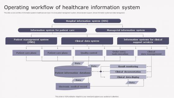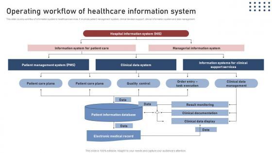 This slide covers workflow of information system in healthcare services. It involves patient management system, clinical decision support, clinical information system and data management. Here you can discover an assortment of the finest PowerPoint and Google Slides templates. With these templates, you can create presentations for a variety of purposes while simultaneously providing your audience with an eye catching visual experience. Download Operating Workflow Healthcare Transforming Medicare Services Using Health Structure Pdf to deliver an impeccable presentation. These templates will make your job of preparing presentations much quicker, yet still, maintain a high level of quality. Slidegeeks has experienced researchers who prepare these templates and write high quality content for you. Later on, you can personalize the content by editing the Operating Workflow Healthcare Transforming Medicare Services Using Health Structure Pdf. This slide covers workflow of information system in healthcare services. It involves patient management system, clinical decision support, clinical information system and data management.