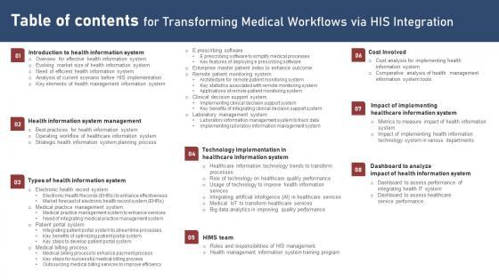 From laying roadmaps to briefing everything in detail, our templates are perfect for you. You can set the stage with your presentation slides. All you have to do is download these easy to edit and customizable templates. Transforming Medical Workflows Via His Integration Table Of Contents Introduction Pdf will help you deliver an outstanding performance that everyone would remember and praise you for. Do download this presentation today. Our Transforming Medical Workflows Via His Integration Table Of Contents Introduction Pdf are topically designed to provide an attractive backdrop to any subject. Use them to look like a presentation pro.