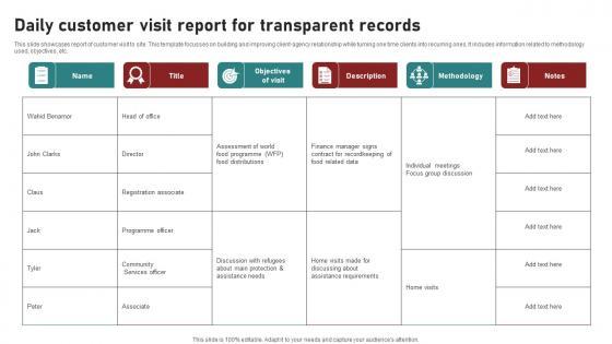 This slide showcases report of customer visit to site. This template focusses on building and improving client-agency relationship while turning one time clients into recurring ones. It includes information related to methodology used, objectives, etc. Pitch your topic with ease and precision using this Daily Customer Visit Report For Transparent Records Ppt Layouts Show pdf. This layout presents information on Objectives Visit, Methodology, Wahid Benamor. It is also available for immediate download and adjustment. So, changes can be made in the color, design, graphics or any other component to create a unique layout. This slide showcases report of customer visit to site. This template focusses on building and improving client-agency relationship while turning one time clients into recurring ones. It includes information related to methodology used, objectives, etc.