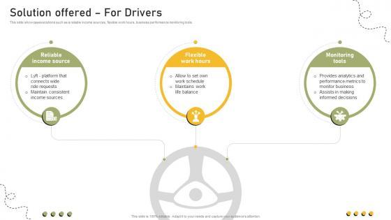 This slide showcases solutions such as a reliable income sources, flexible work hours, business performance monitoring tools. If you are looking for a format to display your unique thoughts, then the professionally designed Solution Offered For Drivers Shared Transportation Platform Business Model BMC SS V is the one for you. You can use it as a Google Slides template or a PowerPoint template. Incorporate impressive visuals, symbols, images, and other charts. Modify or reorganize the text boxes as you desire. Experiment with shade schemes and font pairings. Alter, share or cooperate with other people on your work. Download Solution Offered For Drivers Shared Transportation Platform Business Model BMC SS V and find out how to give a successful presentation. Present a perfect display to your team and make your presentation unforgettable. This slide showcases solutions such as a reliable income sources, flexible work hours, business performance monitoring tools.