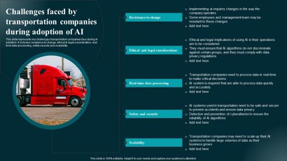 This slide represents key challenges transportation companies face during AI adoption. It includes resistance to change, ethical and legal consideration, real-time data processing, safety security and scalability. Retrieve professionally designed Challenges Faced By Transportation Companies During Applications And Impact Infographics Pdf to effectively convey your message and captivate your listeners. Save time by selecting pre-made slideshows that are appropriate for various topics, from business to educational purposes. These themes come in many different styles, from creative to corporate, and all of them are easily adjustable and can be edited quickly. Access them as PowerPoint templates or as Google Slides themes. You do not have to go on a hunt for the perfect presentation because Slidegeeks got you covered from everywhere. This slide represents key challenges transportation companies face during AI adoption. It includes resistance to change, ethical and legal consideration, real-time data processing, safety security and scalability.