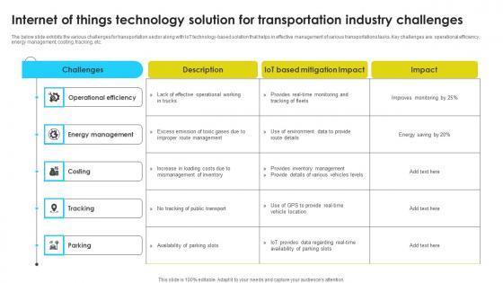 The below slide exhibits the various challenges for transportation sector along with IoT technology-based solution that helps in effective management of various transportations tasks. Key challenges are operational efficiency, energy management, costing, tracking, etc. Pitch your topic with ease and precision using this Internet Of Things Technology Solution For Transportation Industry Challenges Slides Pdf This layout presents information on Operational Efficiency, Energy Management, Tracking It is also available for immediate download and adjustment. So, changes can be made in the color, design, graphics or any other component to create a unique layout. The below slide exhibits the various challenges for transportation sector along with IoT technology-based solution that helps in effective management of various transportations tasks. Key challenges are operational efficiency, energy management, costing, tracking, etc.