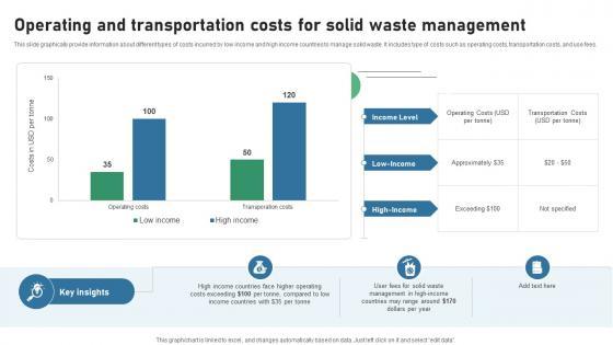 This slide graphically provide information about different types of costs incurred by low income and high income countries to manage solid waste. It includes type of costs such as operating costs, transportation costs, and use fees. Find a pre-designed and impeccable Operating And Transportation Costs For Solid Waste IOT Applications In Smart Waste IoT SS V. The templates can ace your presentation without additional effort. You can download these easy-to-edit presentation templates to make your presentation stand out from others. So, what are you waiting for Download the template from Slidegeeks today and give a unique touch to your presentation. This slide graphically provide information about different types of costs incurred by low income and high income countries to manage solid waste. It includes type of costs such as operating costs, transportation costs, and use fees.