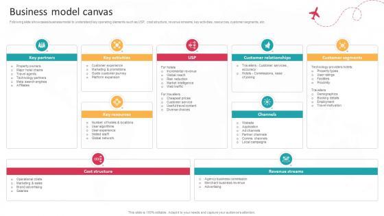 Following slide showcases business model to understand key operating elements such as USP, cost structure, revenue streams, key activities, resources, customer segments, etc. Find a pre-designed and impeccable Business Model Canvas Global Travel Booking System Business Model BMC SS V. The templates can ace your presentation without additional effort. You can download these easy-to-edit presentation templates to make your presentation stand out from others. So, what are you waiting for Download the template from Slidegeeks today and give a unique touch to your presentation. Following slide showcases business model to understand key operating elements such as USP, cost structure, revenue streams, key activities, resources, customer segments, etc.