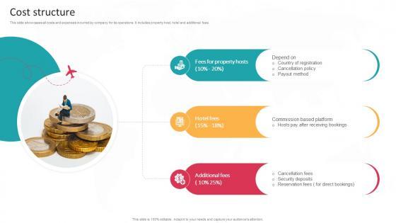 This slide showcases all costs and expenses incurred by company for its operations. It includes property host, hotel and additional fees. Create an editable Cost Structure Global Travel Booking System Business Model BMC SS V that communicates your idea and engages your audience. Whether you are presenting a business or an educational presentation, pre-designed presentation templates help save time. Cost Structure Global Travel Booking System Business Model BMC SS V is highly customizable and very easy to edit, covering many different styles from creative to business presentations. Slidegeeks has creative team members who have crafted amazing templates. So, go and get them without any delay. This slide showcases all costs and expenses incurred by company for its operations. It includes property host, hotel and additional fees.