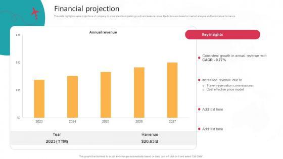 This slide highlights sales projections of company to understand anticipated growth and sales revenue. Predictions are based on market analysis and historical performance. There are so many reasons you need a Financial Projection Global Travel Booking System Business Model BMC SS V. The first reason is you can not spend time making everything from scratch, Thus, Slidegeeks has made presentation templates for you too. You can easily download these templates from our website easily. This slide highlights sales projections of company to understand anticipated growth and sales revenue. Predictions are based on market analysis and historical performance.