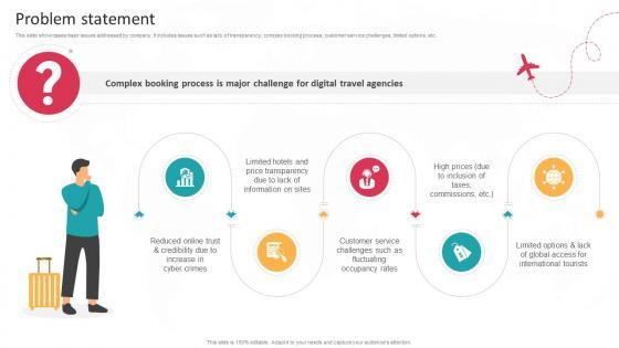 This slide showcases major issues addressed by company. It includes issues such as lack of transparency, complex booking process, customer service challenges, limited options, etc. Whether you have daily or monthly meetings, a brilliant presentation is necessary. Problem Statement Global Travel Booking System Business Model BMC SS V can be your best option for delivering a presentation. Represent everything in detail using Problem Statement Global Travel Booking System Business Model BMC SS V and make yourself stand out in meetings. The template is versatile and follows a structure that will cater to your requirements. All the templates prepared by Slidegeeks are easy to download and edit. Our research experts have taken care of the corporate themes as well. So, give it a try and see the results. This slide showcases major issues addressed by company. It includes issues such as lack of transparency, complex booking process, customer service challenges, limited options, etc.