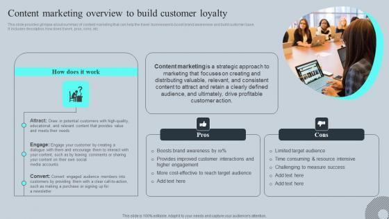 This slide provides glimpse about summary of content marketing that can help the travel businesses to boost brand awareness and build customer base. It includes description, how does it work, pros, cons, etc. Whether you have daily or monthly meetings, a brilliant presentation is necessary. Tour And Travel Agency Marketing Content Marketing Overview To Build Customer Loyalty Template PDF can be your best option for delivering a presentation. Represent everything in detail using Tour And Travel Agency Marketing Content Marketing Overview To Build Customer Loyalty Template PDF and make yourself stand out in meetings. The template is versatile and follows a structure that will cater to your requirements. All the templates prepared by Slidegeeks are easy to download and edit. Our research experts have taken care of the corporate themes as well. So, give it a try and see the results.