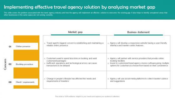 This slide covers the problem associated with the travel agency industry and how the agency will implement an effective solution to overcome the existing gap. It also helps to identify unexplored areas that other businesses in the same space are not serving currently. Retrieve professionally designed Implementing Effective Travel Group Tour Operator Business Plan Go To Market Strategy Information Pdf to effectively convey your message and captivate your listeners. Save time by selecting pre made slideshows that are appropriate for various topics, from business to educational purposes. These themes come in many different styles, from creative to corporate, and all of them are easily adjustable and can be edited quickly. Access them as PowerPoint templates or as Google Slides themes. You do not have to go on a hunt for the perfect presentation because Slidegeeks got you covered from everywhere. This slide covers the problem associated with the travel agency industry and how the agency will implement an effective solution to overcome the existing gap. It also helps to identify unexplored areas that other businesses in the same space are not serving currently.