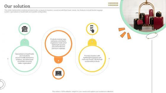 This slide mentions the solutions provided by the company to travelers concerned with their travel needs. Key features include flexible luggage system, specialized compartments and specific configuration. Crafting an eye-catching presentation has never been more straightforward. Let your presentation shine with this tasteful yet straightforward Our Solution Travel Bag Funding Pitch Deck template. It offers a minimalistic and classy look that is great for making a statement. The colors have been employed intelligently to add a bit of playfulness while still remaining professional. Construct the ideal Our Solution Travel Bag Funding Pitch Deck that effortlessly grabs the attention of your audience Begin now and be certain to wow your customers This slide mentions the solutions provided by the company to travelers concerned with their travel needs. Key features include flexible luggage system, specialized compartments and specific configuration.