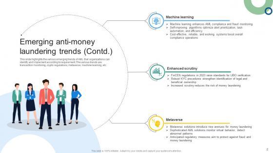 This slide highlights the various emerging trends of AML that organizations can identify and implement according to requirement. The various trends are transaction monitoring, crypto regulations, metaverse, machine learning, etc. Formulating a presentation can take up a lot of effort and time, so the content and message should always be the primary focus. The visuals of the PowerPoint can enhance the presenters message, so our Emerging Anti Money Laundering Trends Mapping Out The Anti Money Fin SS V was created to help save time. Instead of worrying about the design, the presenter can concentrate on the message while our designers work on creating the ideal templates for whatever situation is needed. Slidegeeks has experts for everything from amazing designs to valuable content, we have put everything into Emerging Anti Money Laundering Trends Mapping Out The Anti Money Fin SS V This slide highlights the various emerging trends of AML that organizations can identify and implement according to requirement. The various trends are transaction monitoring, crypto regulations, metaverse, machine learning, etc.