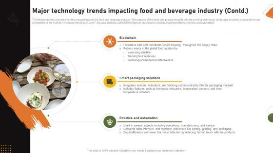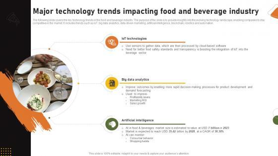 The following slide covers the key technology trends in the food and beverage industry. The purpose of the slide is to provide insights into the evolving technology landscape, enabling companies to stay competitive in the market. It includes trends such as IoT, big data analytics, data-driven marketing, artificial intelligence, blockchain, robotics and automation. Coming up with a presentation necessitates that the majority of the effort goes into the content and the message you intend to convey. The visuals of a PowerPoint presentation can only be effective if it supplements and supports the story that is being told. Keeping this in mind our experts created Food And Drink Industry Report Major Technology Trends Impacting Food And Beverage Industry IR SS V to reduce the time that goes into designing the presentation. This way, you can concentrate on the message while our designers take care of providing you with the right template for the situation. The following slide covers the key technology trends in the food and beverage industry. The purpose of the slide is to provide insights into the evolving technology landscape, enabling companies to stay competitive in the market. It includes trends such as IoT, big data analytics, data-driven marketing, artificial intelligence, blockchain, robotics and automation.