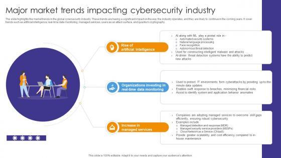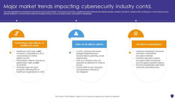 The slide highlights the market trends in the global cybersecurity industry. These trends are having a significant impact on the way the industry operates, and they are likely to continue in the coming years. It cover trends such as artificial intelligence, real-time data monitoring, managed services, users as an attack surface, and quantum cryptography. Coming up with a presentation necessitates that the majority of the effort goes into the content and the message you intend to convey. The visuals of a PowerPoint presentation can only be effective if it supplements and supports the story that is being told. Keeping this in mind our experts created Global Data Security Industry Report Major Market Trends Impacting Cybersecurity Industry IR SS V to reduce the time that goes into designing the presentation. This way, you can concentrate on the message while our designers take care of providing you with the right template for the situation. The slide highlights the market trends in the global cybersecurity industry. These trends are having a significant impact on the way the industry operates, and they are likely to continue in the coming years. It cover trends such as artificial intelligence, real-time data monitoring, managed services, users as an attack surface, and quantum cryptography.