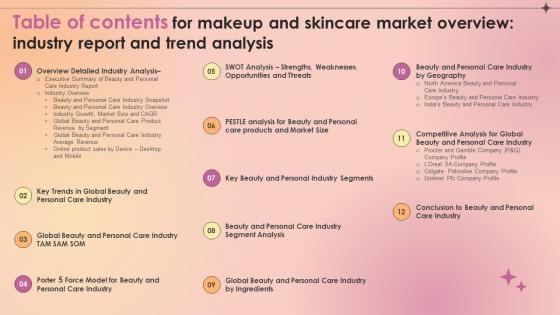The Table Of Contents Makeup And Skincare Market Overview Industry Report And Trend IR SS V is a compilation of the most recent design trends as a series of slides. It is suitable for any subject or industry presentation, containing attractive visuals and photo spots for businesses to clearly express their messages. This template contains a variety of slides for the user to input data, such as structures to contrast two elements, bullet points, and slides for written information. Slidegeeks is prepared to create an impression. Our Table Of Contents Makeup And Skincare Market Overview Industry Report And Trend IR SS V are topically designed to provide an attractive backdrop to any subject. Use them to look like a presentation pro.