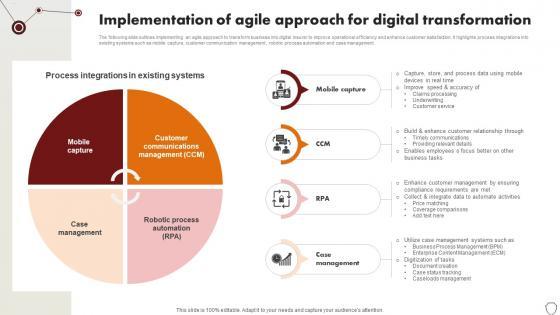 The following slide outlines implementing an agile approach to transform business into digital insurer to improve operational efficiency and enhance customer satisfaction. It highlights process integrations into existing systems such as mobile capture, customer communication management, robotic process automation and case management. Here you can discover an assortment of the finest PowerPoint and Google Slides templates. With these templates, you can create presentations for a variety of purposes while simultaneously providing your audience with an eye-catching visual experience. Download Technology Trends In Online Insurance Implementation Of Agile Approach For Digital Transformation to deliver an impeccable presentation. These templates will make your job of preparing presentations much quicker, yet still, maintain a high level of quality. Slidegeeks has experienced researchers who prepare these templates and write high-quality content for you. Later on, you can personalize the content by editing the Technology Trends In Online Insurance Implementation Of Agile Approach For Digital Transformation. The following slide outlines implementing an agile approach to transform business into digital insurer to improve operational efficiency and enhance customer satisfaction. It highlights process integrations into existing systems such as mobile capture, customer communication management, robotic process automation and case management.