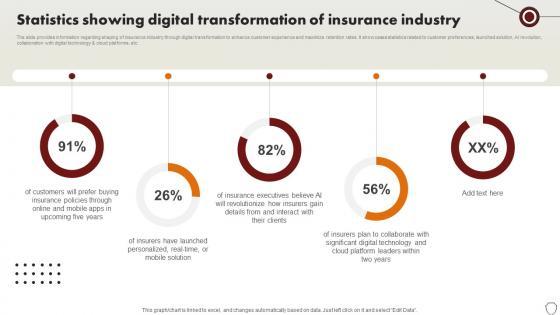 The slide provides information regarding shaping of insurance industry through digital transformation to enhance customer experience and maximize retention rates. It showcases statistics related to customer preferences, launched solution, AI revolution, collaboration with digital technology and cloud platforms, etc. Make sure to capture your audiences attention in your business displays with our gratis customizable Technology Trends In Online Insurance Statistics Showing Digital Transformation Of Insurance Industry. These are great for business strategies, office conferences, capital raising or task suggestions. If you desire to acquire more customers for your tech business and ensure they stay satisfied, create your own sales presentation with these plain slides. The slide provides information regarding shaping of insurance industry through digital transformation to enhance customer experience and maximize retention rates. It showcases statistics related to customer preferences, launched solution, AI revolution, collaboration with digital technology and cloud platforms, etc.