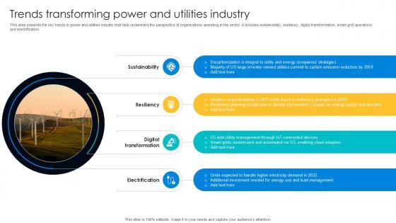 This slide presents the key trends in power and utilities industry that help understand the perspective of organizations operating in the sector. It includes sustainability, resiliency, digital transformation, smart grid operations and electrification. Slidegeeks has constructed Digital Transformation, Electrification, Resiliency, Sustainability after conducting extensive research and examination. These presentation templates are constantly being generated and modified based on user preferences and critiques from editors. Here, you will find the most attractive templates for a range of purposes while taking into account ratings and remarks from users regarding the content. This is an excellent jumping-off point to explore our content and will give new users an insight into our top-notch PowerPoint Templates. This slide presents the key trends in power and utilities industry that help understand the perspective of organizations operating in the sector. It includes sustainability, resiliency, digital transformation, smart grid operations and electrification.
