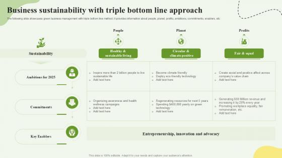 The following slide showcases green business management with triple bottom line method. It provides information about people, planet, profits, ambitions, commitments, enablers, etcPresenting Business Corporate Sustainability With Triple Bottom Line Approach Clipart PDF to dispense important information. This template comprises three stages. It also presents valuable insights into the topics including Sustainable Living, Circular Climate, Fair Equal. This is a completely customizable PowerPoint theme that can be put to use immediately. So, download it and address the topic impactfully.