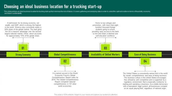This slide portrays an ideal business location for trucking start up that minimize the risk of failure. It covers gathering and analyzing data in order to select the optimal location in terms of feasibility, economy, and future sustainability.Create an editable Choosing An Ideal Business Location Trucking Services Business Plan Icons Pdf that communicates your idea and engages your audience. Whether you are presenting a business or an educational presentation, pre-designed presentation templates help save time. Choosing An Ideal Business Location Trucking Services Business Plan Icons Pdf is highly customizable and very easy to edit, covering many different styles from creative to business presentations. Slidegeeks has creative team members who have crafted amazing templates. So, go and get them without any delay. This slide portrays an ideal business location for trucking start up that minimize the risk of failure. It covers gathering and analyzing data in order to select the optimal location in terms of feasibility, economy, and future sustainability.