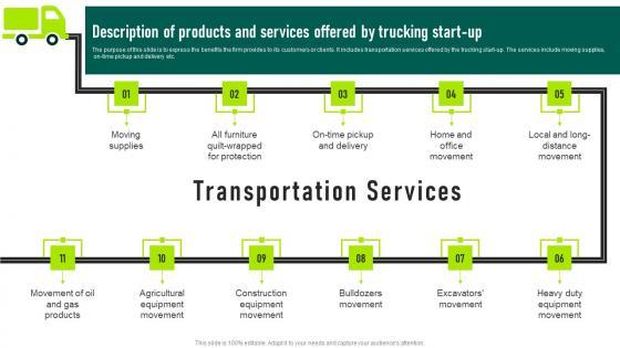 The purpose of this slide is to express the benefits the firm provides to its customers or clients. It includes transportation services offered by the trucking start up. The services include moving supplies, on time pickup and delivery etc.Get a simple yet stunning designed Description Of Products And Services Offered Trucking Services Business Plan Designs Pdf It is the best one to establish the tone in your meetings. It is an excellent way to make your presentations highly effective. So, download this PPT today from Slidegeeks and see the positive impacts. Our easy-to-edit Description Of Products And Services Offered Trucking Services Business Plan Designs Pdf can be your go-to option for all upcoming conferences and meetings. So, what are you waiting for Grab this template today. The purpose of this slide is to express the benefits the firm provides to its customers or clients. It includes transportation services offered by the trucking start up. The services include moving supplies, on time pickup and delivery etc.
