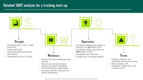 The slide includes the strengths, weaknesses, opportunities, and threats analysis of the trucking start up. It helps in building what the company does well, and what it lacks, seizing new openings, and minimizing risks. Present like a pro with Detailed Swot Analysis For A Trucking Start Up Trucking Services Business Plan Elements Pdf Create beautiful presentations together with your team, using our easy-to-use presentation slides. Share your ideas in real-time and make changes on the fly by downloading our templates. So whether you are in the office, on the go, or in a remote location, you can stay in sync with your team and present your ideas with confidence. With Slidegeeks presentation got a whole lot easier. Grab these presentations today. The slide includes the strengths, weaknesses, opportunities, and threats analysis of the trucking start up. It helps in building what the company does well, and what it lacks, seizing new openings, and minimizing risks.