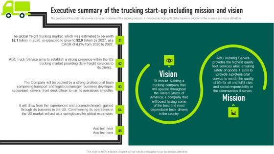 The purpose of this slide is to provide a broader overview of the trucking industry. It includes key highlights of the market in addition to the mission and vision of the firm.If you are looking for a format to display your unique thoughts, then the professionally designed Executive Summary Of The Trucking Trucking Services Business Plan Designs Pdf is the one for you. You can use it as a Google Slides template or a PowerPoint template. Incorporate impressive visuals, symbols, images, and other charts. Modify or reorganize the text boxes as you desire. Experiment with shade schemes and font pairings. Alter, share or cooperate with other people on your work. Download Executive Summary Of The Trucking Trucking Services Business Plan Designs Pdf and find out how to give a successful presentation. Present a perfect display to your team and make your presentation unforgettable. The purpose of this slide is to provide a broader overview of the trucking industry. It includes key highlights of the market in addition to the mission and vision of the firm.