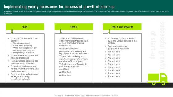 The purpose of this slide is to facilitate managers to convey project progress updates to stakeholders and get their approvals. The slide portrays key milestones of the trucking start up to be achieved in the year 1, year 3, and years 5 onwards. Crafting an eye-catching presentation has never been more straightforward. Let your presentation shine with this tasteful yet straightforward Implementing Yearly Milestones Trucking Services Business Plan Infographics Pdf template. It offers a minimalistic and classy look that is great for making a statement. The colors have been employed intelligently to add a bit of playfulness while still remaining professional. Construct the ideal Implementing Yearly Milestones Trucking Services Business Plan Infographics Pdf that effortlessly grabs the attention of your audience. Begin now and be certain to wow your customers. The purpose of this slide is to facilitate managers to convey project progress updates to stakeholders and get their approvals. The slide portrays key milestones of the trucking start up to be achieved in the year 1, year 3, and years 5 onwards.