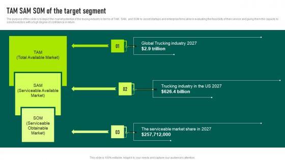 The purpose of this slide is to depict the market potential of the trucing industry in terms of TAM, SAM, and SOM to assist startups and enterprise firms alike in evaluating the feasibility of their service and giving them the capacity to solicit investors with a high degree of confidence in return.Are you searching for a Tam Sam Som Of The Target Segment Trucking Services Business Plan Download Pdf that is uncluttered, straightforward, and original Its easy to edit, and you can change the colors to suit your personal or business branding. For a presentation that expresses how much effort you have put in, this template is ideal. With all of its features, including tables, diagrams, statistics, and lists, its perfect for a business plan presentation. Make your ideas more appealing with these professional slides. Download Tam Sam Som Of The Target Segment Trucking Services Business Plan Download Pdf from Slidegeeks today. The purpose of this slide is to depict the market potential of the trucing industry in terms of TAM, SAM, and SOM to assist startups and enterprise firms alike in evaluating the feasibility of their service and giving them the capacity to solicit investors with a high degree of confidence in return.