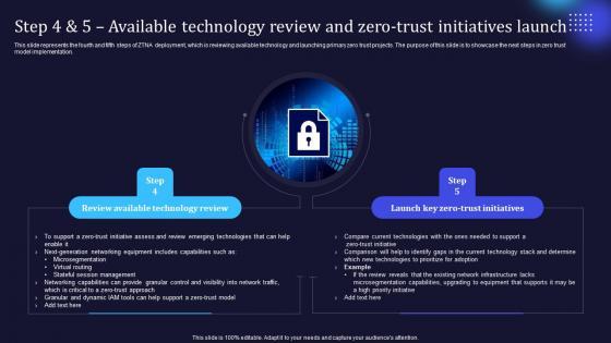 This slide represents the fourth and fifth steps of ZTNA deployment, which is reviewing available technology and launching primary zero trust projects. The purpose of this slide is to showcase the next steps in zero trust model implementation. From laying roadmaps to briefing everything in detail, our templates are perfect for you. You can set the stage with your presentation slides. All you have to do is download these easy-to-edit and customizable templates. Zero Trust Model Step 4 And 5 Available Technology Review And Zero Trust will help you deliver an outstanding performance that everyone would remember and praise you for. Do download this presentation today. This slide represents the fourth and fifth steps of ZTNA deployment, which is reviewing available technology and launching primary zero trust projects. The purpose of this slide is to showcase the next steps in zero trust model implementation.