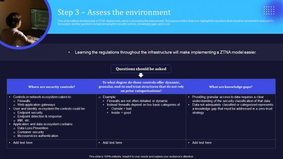 This slide outlines the third step of ZTNA deployment, which is assessing the environment. The purpose of this slide is to highlight the questions that should be answered to evaluate the ecosystem and the questions include knowing the security controls, knowledge gaps and so on. If your project calls for a presentation, then Slidegeeks is your go-to partner because we have professionally designed, easy-to-edit templates that are perfect for any presentation. After downloading, you can easily edit Zero Trust Network Access Step 3 Assess The Environment and make the changes accordingly. You can rearrange slides or fill them with different images. Check out all the handy templates This slide outlines the third step of ZTNA deployment, which is assessing the environment. The purpose of this slide is to highlight the questions that should be answered to evaluate the ecosystem and the questions include knowing the security controls, knowledge gaps and so on.