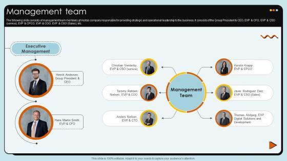 The following slide consists of management team members at Vestas company responsible for providing strategic and operational leadership to the business. It consists of the Group President and CEO, EVP and CFO, EVP and CSO service, EVP and CPCO, EVP and COO, EVP and CSO Sales, etc.Formulating a presentation can take up a lot of effort and time, so the content and message should always be the primary focus. The visuals of the PowerPoint can enhance the presenters message, so our Management Team Wind Turbines Manufacturer Company Profile CP SS V was created to help save time. Instead of worrying about the design, the presenter can concentrate on the message while our designers work on creating the ideal templates for whatever situation is needed. Slidegeeks has experts for everything from amazing designs to valuable content, we have put everything into Management Team Wind Turbines Manufacturer Company Profile CP SS V. The following slide consists of management team members at Vestas company responsible for providing strategic and operational leadership to the business. It consists of the Group President and CEO, EVP and CFO, EVP and CSO service, EVP and CPCO, EVP and COO, EVP and CSO Sales, etc.