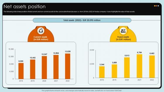 The following slide shows position of total current and non-current assets for five consecutive financial years i.e. from 2018 to 2022 of Vestas company. It also highlights the value of total assets. Coming up with a presentation necessitates that the majority of the effort goes into the content and the message you intend to convey. The visuals of a PowerPoint presentation can only be effective if it supplements and supports the story that is being told. Keeping this in mind our experts created Net Assets Position Wind Turbines Manufacturer Company Profile CP SS V to reduce the time that goes into designing the presentation. This way, you can concentrate on the message while our designers take care of providing you with the right template for the situation. The following slide shows position of total current and non-current assets for five consecutive financial years i.e. from 2018 to 2022 of Vestas company. It also highlights the value of total assets.