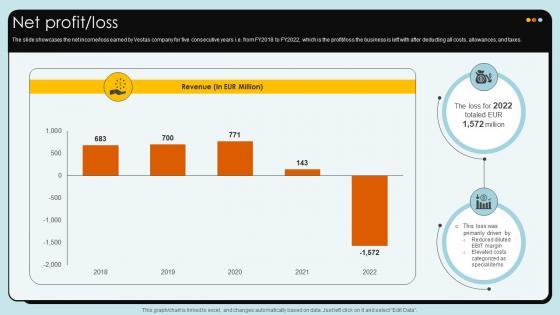 The slide showcases the net income or loss earned by Vestas company for five consecutive years i.e. from FY2018 to FY2022, which is the profit or loss the business is left with after deducting all costs, allowances, and taxes.This modern and well-arranged Net Profit Loss Wind Turbines Manufacturer Company Profile CP SS V provides lots of creative possibilities. It is very simple to customize and edit with the Powerpoint Software. Just drag and drop your pictures into the shapes. All facets of this template can be edited with Powerpoint, no extra software is necessary. Add your own material, put your images in the places assigned for them, adjust the colors, and then you can show your slides to the world, with an animated slide included. The slide showcases the net income or loss earned by Vestas company for five consecutive years i.e. from FY2018 to FY2022, which is the profit or loss the business is left with after deducting all costs, allowances, and taxes.