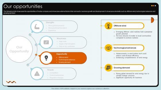 The following slide showcases the opportunities of Vestas company and showcases external factors that can lead to business growth and development. It showcases elements such as offshore wind, technological advances and growing demand.Explore a selection of the finest Our Opportunities Wind Turbines Manufacturer Company Profile CP SS V here. With a plethora of professionally designed and pre-made slide templates, you can quickly and easily find the right one for your upcoming presentation. You can use our Our Opportunities Wind Turbines Manufacturer Company Profile CP SS V to effectively convey your message to a wider audience. Slidegeeks has done a lot of research before preparing these presentation templates. The content can be personalized and the slides are highly editable. Grab templates today from Slidegeeks. The following slide showcases the opportunities of Vestas company and showcases external factors that can lead to business growth and development. It showcases elements such as offshore wind, technological advances and growing demand.