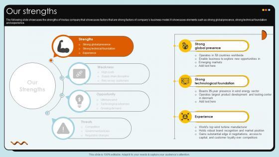 The following slide showcases the strengths of Vestas company that showcases factors that are strong factors of companys business model. It showcases elements such as strong global presence, strong technical foundation and experience.The best PPT templates are a great way to save time, energy, and resources. Slidegeeks have 100 percent editable powerpoint slides making them incredibly versatile. With these quality presentation templates, you can create a captivating and memorable presentation by combining visually appealing slides and effectively communicating your message. Download Our Strengths Wind Turbines Manufacturer Company Profile CP SS V from Slidegeeks and deliver a wonderful presentation. The following slide showcases the strengths of Vestas company that showcases factors that are strong factors of companys business model. It showcases elements such as strong global presence, strong technical foundation and experience.