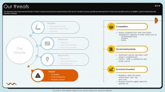 The following slide showcases the weakness of Vestas company and showcases internal factors that are limitations of companys business model. It showcases elements such as high costs, supply chain disruptions and rely onThe Our Threats Wind Turbines Manufacturer Company Profile CP SS V is a compilation of the most recent design trends as a series of slides. It is suitable for any subject or industry presentation, containing attractive visuals and photo spots for businesses to clearly express their messages. This template contains a variety of slides for the user to input data, such as structures to contrast two elements, bullet points, and slides for written information. Slidegeeks is prepared to create an impression. The following slide showcases the weakness of Vestas company and showcases internal factors that are limitations of companys business model. It showcases elements such as high costs, supply chain disruptions and rely on