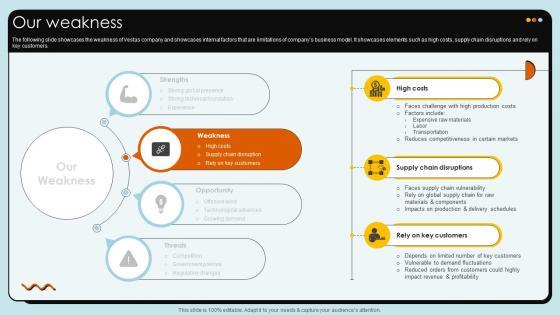 The following slide showcases the weakness of Vestas company and showcases internal factors that are limitations of companys business model. It showcases elements such as high costs, supply chain disruptions and rely onAre you searching for a Our Weakness Wind Turbines Manufacturer Company Profile CP SS V that is uncluttered, straightforward, and original Its easy to edit, and you can change the colors to suit your personal or business branding. For a presentation that expresses how much effort you have put in, this template is ideal With all of its features, including tables, diagrams, statistics, and lists, its perfect for a business plan presentation. Make your ideas more appealing with these professional slides. Download Our Weakness Wind Turbines Manufacturer Company Profile CP SS V from Slidegeeks today. The following slide showcases the weakness of Vestas company and showcases internal factors that are limitations of companys business model. It showcases elements such as high costs, supply chain disruptions and rely on