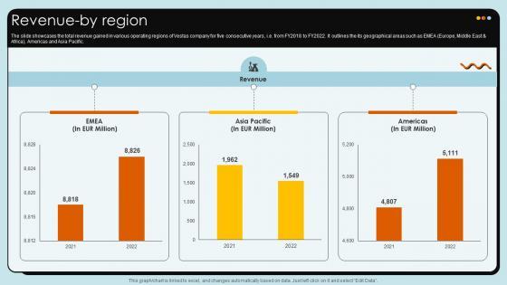 The slide showcases the total revenue gained in various operating regions of Vestas company for five consecutive years, i.e. from FY2018 to FY2022. It outlines the its geographical areas such as EMEA Europe, Middle East and Africa, Americas and Asia Pacific.Retrieve professionally designed Revenue By Region Wind Turbines Manufacturer Company Profile CP SS V to effectively convey your message and captivate your listeners. Save time by selecting pre-made slideshows that are appropriate for various topics, from business to educational purposes. These themes come in many different styles, from creative to corporate, and all of them are easily adjustable and can be edited quickly. Access them as PowerPoint templates or as Google Slides themes. You do not have to go on a hunt for the perfect presentation because Slidegeeks got you covered from everywhere. The slide showcases the total revenue gained in various operating regions of Vestas company for five consecutive years, i.e. from FY2018 to FY2022. It outlines the its geographical areas such as EMEA Europe, Middle East and Africa, Americas and Asia Pacific.