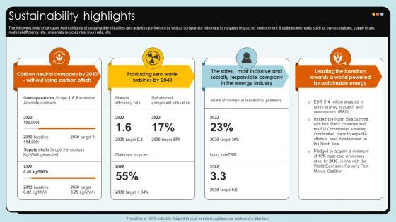 The following slide showcases key highlights of sustainability initiatives and activities performed by Vestas company to minimize its negative impact on environment. It outlines elements such as own operations, supply chain, material efficiency rate, materials recycles rate, injury rate, etc.Presenting this PowerPoint presentation, titled Sustainability Highlights Wind Turbines Manufacturer Company Profile CP SS V, with topics curated by our researchers after extensive research. This editable presentation is available for immediate download and provides attractive features when used. Download now and captivate your audience. Presenting this Sustainability Highlights Wind Turbines Manufacturer Company Profile CP SS V. Our researchers have carefully researched and created these slides with all aspects taken into consideration. This is a completely customizable Sustainability Highlights Wind Turbines Manufacturer Company Profile CP SS V that is available for immediate downloading. Download now and make an impact on your audience. Highlight the attractive features available with our PPTs. The following slide showcases key highlights of sustainability initiatives and activities performed by Vestas company to minimize its negative impact on environment. It outlines elements such as own operations, supply chain, material efficiency rate, materials recycles rate, injury rate, etc.