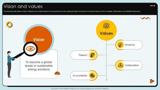 The following slide outlines Vestas companys vision statement and core values that act as the guiding principles of business. It consists of values such as simplicity, collaboration, accountability and passion.This Vision And Values Wind Turbines Manufacturer Company Profile CP SS V from Slidegeeks makes it easy to present information on your topic with precision. It provides customization options, so you can make changes to the colors, design, graphics, or any other component to create a unique layout. It is also available for immediate download, so you can begin using it right away. Slidegeeks has done good research to ensure that you have everything you need to make your presentation stand out. Make a name out there for a brilliant performance. The following slide outlines Vestas companys vision statement and core values that act as the guiding principles of business. It consists of values such as simplicity, collaboration, accountability and passion.