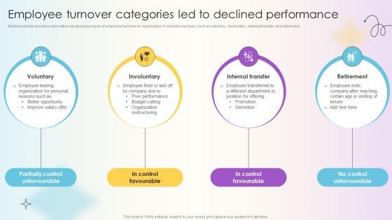 Mentioned slide provides information about various types of employee turnover in organization. It includes key types such as voluntary, involuntary, internal transfer, and retirement. This modern and well-arranged Managing Technical And Non Employee Turnover Categories Led To Declined Performance provides lots of creative possibilities. It is very simple to customize and edit with the Powerpoint Software. Just drag and drop your pictures into the shapes. All facets of this template can be edited with Powerpoint, no extra software is necessary. Add your own material, put your images in the places assigned for them, adjust the colors, and then you can show your slides to the world, with an animated slide included. Mentioned slide provides information about various types of employee turnover in organization. It includes key types such as voluntary, involuntary, internal transfer, and retirement.