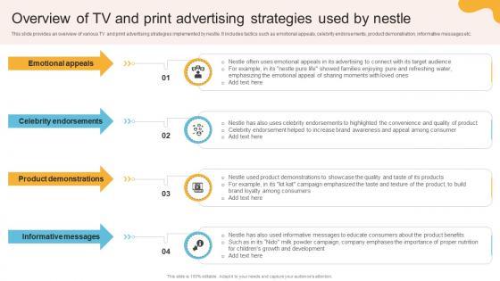 This slide provides an overview of various TV and print advertising strategies implemented by nestle. It includes tactics such as emotional appeals, celebrity endorsements, product demonstration, informative messages etc. This Comprehensive Review Of Nestles Overview Of Tv And Print Advertising Strategies Strategy SS V from Slidegeeks makes it easy to present information on your topic with precision. It provides customization options, so you can make changes to the colors, design, graphics, or any other component to create a unique layout. It is also available for immediate download, so you can begin using it right away. Slidegeeks has done good research to ensure that you have everything you need to make your presentation stand out. Make a name out there for a brilliant performance. This slide provides an overview of various TV and print advertising strategies implemented by nestle. It includes tactics such as emotional appeals, celebrity endorsements, product demonstration, informative messages etc.