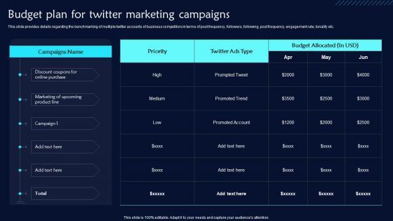 This slide provides details regarding the benchmarking of multiple twitter accounts of business competitors in terms of post frequency, followers, following, post frequency, engagement rate, tonality etc. Whether you have daily or monthly meetings, a brilliant presentation is necessary. Utilizing Twitter For Social Media Budget Plan For Twitter Marketing Campaigns Slides PDF can be your best option for delivering a presentation. Represent everything in detail using Utilizing Twitter For Social Media Budget Plan For Twitter Marketing Campaigns Slides PDF and make yourself stand out in meetings. The template is versatile and follows a structure that will cater to your requirements. All the templates prepared by Slidegeeks are easy to download and edit. Our research experts have taken care of the corporate themes as well. So, give it a try and see the results.